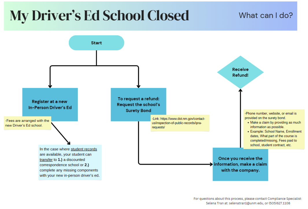 - Description of request include a description similar to:I am having issues with _________(Name of School) in ______ (Location) a driving school under the authority of the Traffic Safety Division of the NMDOT. I am requesting a copy of the Surety Bond information for _________(School Name).